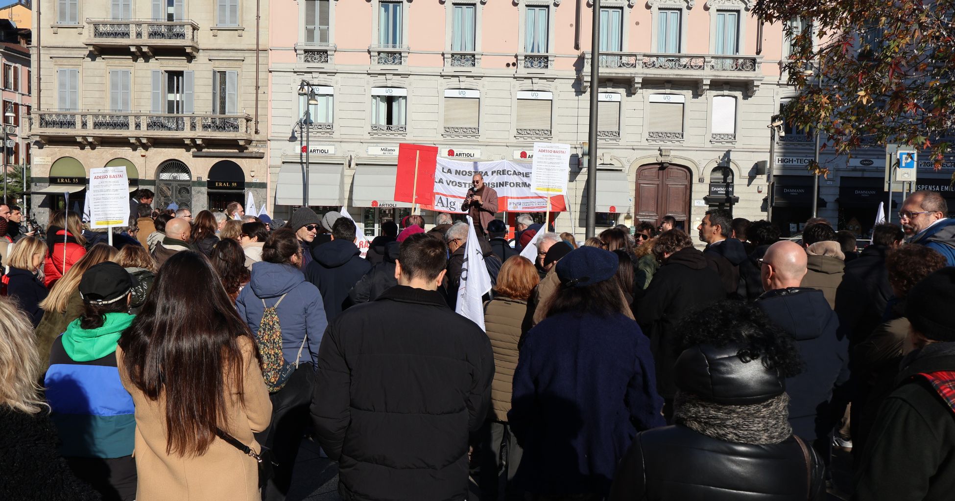 Grande partecipazione oggi, 28 novembre, alla manifestazione dei giornalisti organizzata dalla Alg in piazza XXV aprile. Molti colleghi erano presenti per ribadire che i giornalisti italiani vogliono il loro contratto, ma anche per parlare degli enormi problemi che oggi tutti i giornalisti devono affrontare.