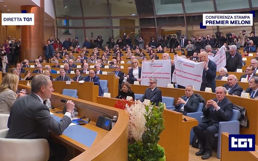 «Giornalisti da 10 anni senza contratto ma alla Fieg finanziamenti milionari»: è il testo di un piccolo striscione mostrato da Alessandra Costante, segretaria generale della Federazione nazionale della Stampa italiana, insieme con il presidente della Fnsi, Vittorio di Trapani, nell’aula dei Gruppi parlamentari della Camera in apertura della conferenza stampa di ‘inizio anno’ della premier Giorgia Meloni, organizzata dal Consiglio nazionale dell’Ordine dei giornalisti in collaborazione con l’Associazione della stampa parlamentare, venerdì 9 gennaio 2025.