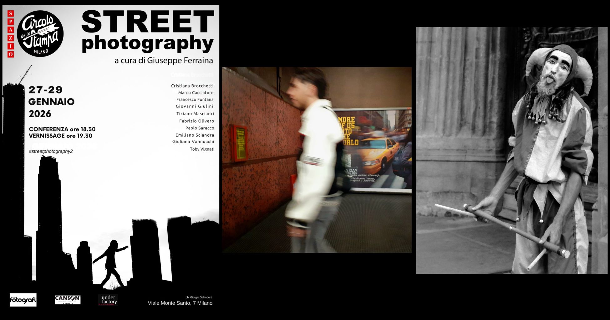 Dal 27 al 29 gennaio lo Spazio Circolo della Stampa dell’Associazione lombarda dei Giornalisti, in viale Monte Santo 7, ospiterà Street Photograhy , la mostra fotografica a cura di Giuseppe Ferraina , che dopo aver inaugurato il ciclo di esposizioni con gli “scatti dalle città e dal mondo” di Stefania Adami, Cinzia Canneri, Giorgio Galimberti e Gianni Nava, punta ora su dieci artisti emergenti provenienti da diverse località d’Italia, tra cui Milano, Genova, Roma e Bari, per sottolineare che « la Street Photography è il genere fotografico più contemporaneo e praticato al mondo. Non solo da fotografi noti, ma anche da un nutrito numero di autori emergenti di talento. È un fenomeno in forte crescita e deve ricevere il giusto interessamento da parte di tutti e soprattutto di chi si occupa di fotografia e di arte ».